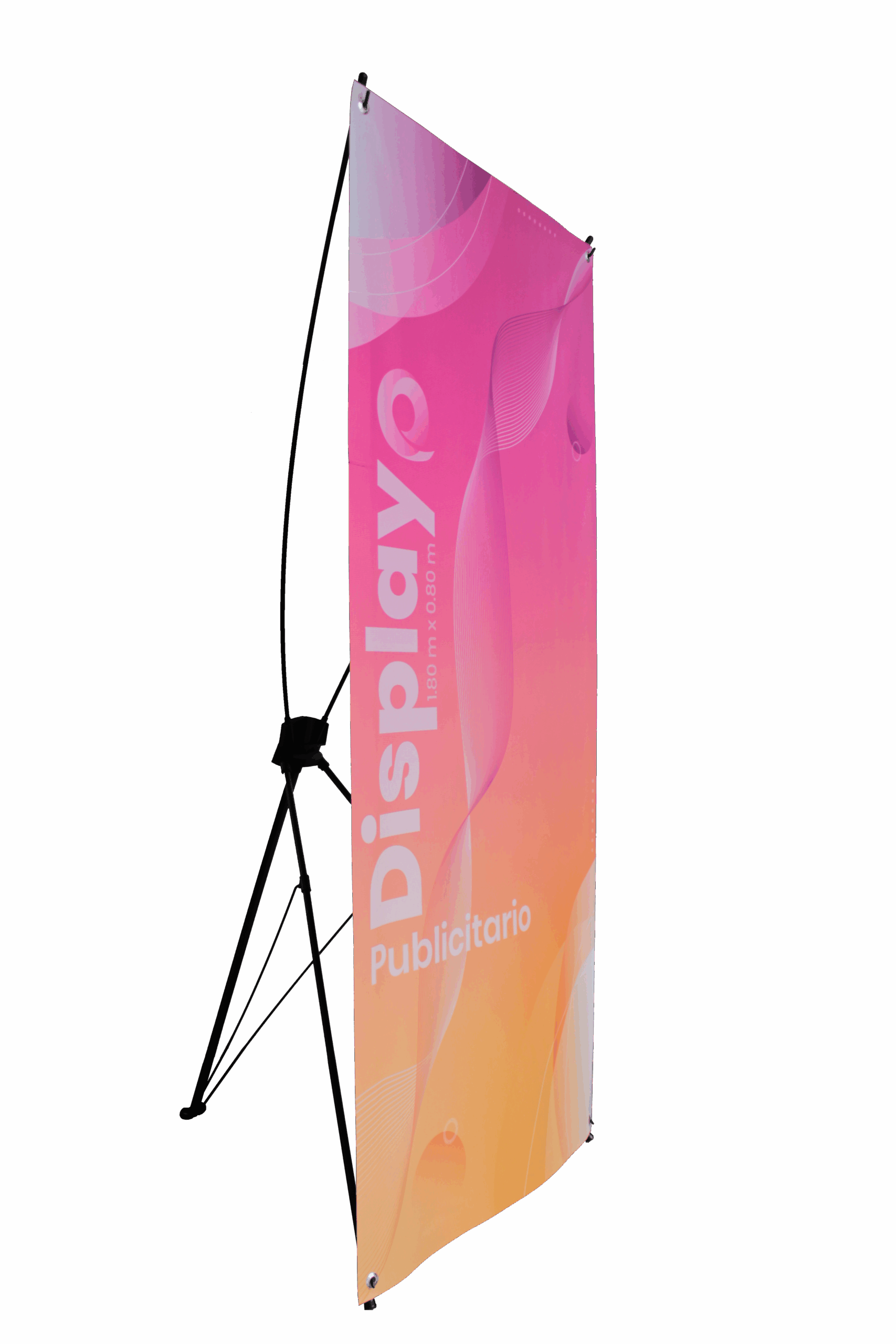 Display tipo araña de 1.80 x 0.80 m, impreso en lona brillante con tinta ecosolvente de mediano formato. Incluye la estructura metálica tipo araña, lista para armar y transportar fácilmente. Ideal para eventos, ferias, presentaciones, puntos de venta o exhibiciones publicitarias en interiores.